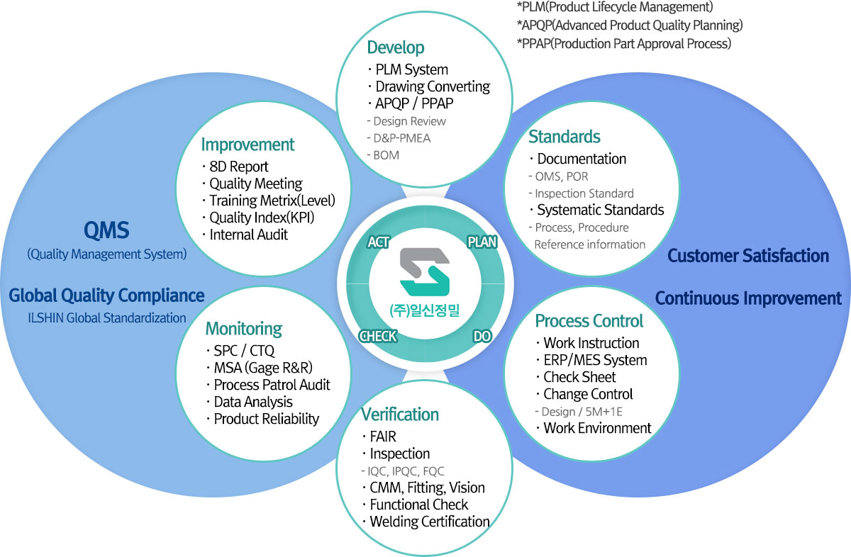 일신 정밀은 반도체 장비, 부품 및 산업 설비에 대한 품질보증으로 고객만족을 실현하고자 합니다. QMS(Quality Management System) 기반으로 개발, 표준 관리, 공정 관리, 제품/공정 검증, 모니터링, 개선을 통한 품질 관리 시스템을 운영하고 있습니다.
